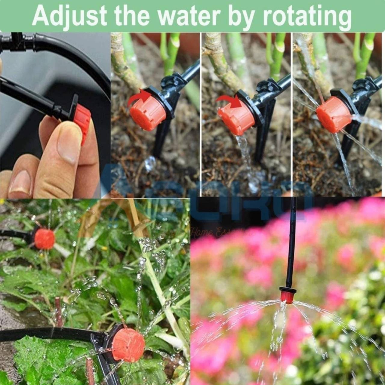 Komplekt sisaldab pihusteid, mida saate hõlpsasti paigaldada otse voolikusse. Looge voolikus soovitud kohas ava, vajutades ja sisestage iga pihusti kindlalt sellesse, et see püsiks kindlalt paigal. Pihustil on pööratav pea, mis võimaldab täielikult reguleerida vooluhulka – pöörates saate reguleerida iga taime saavat veekogust. Pihustitel on ka isepuhastuv süsteem, mis hoiab ära ummistumise, ja 8 väikest ava, mis tagavad ühtlase veejaotuse. Süsteem sobib kasutamiseks aias, kasvuhoonetes, taludes, lillepeenardes või potitaimede jaoks. Seda saab kasutada seemikute, köögiviljade, puuviljade ja dekoratiivtaimede jaoks. Vajadusel lülitage süsteem lihtsalt välja või aktiveerige see uuesti, keerates otsikut ühes või teises suunas. Optimaalse süsteemi töö tagamiseks tagage piisav veesurve ja kontrollige regulaarselt, et avad ei oleks ummistunud mullapartiklitega.
