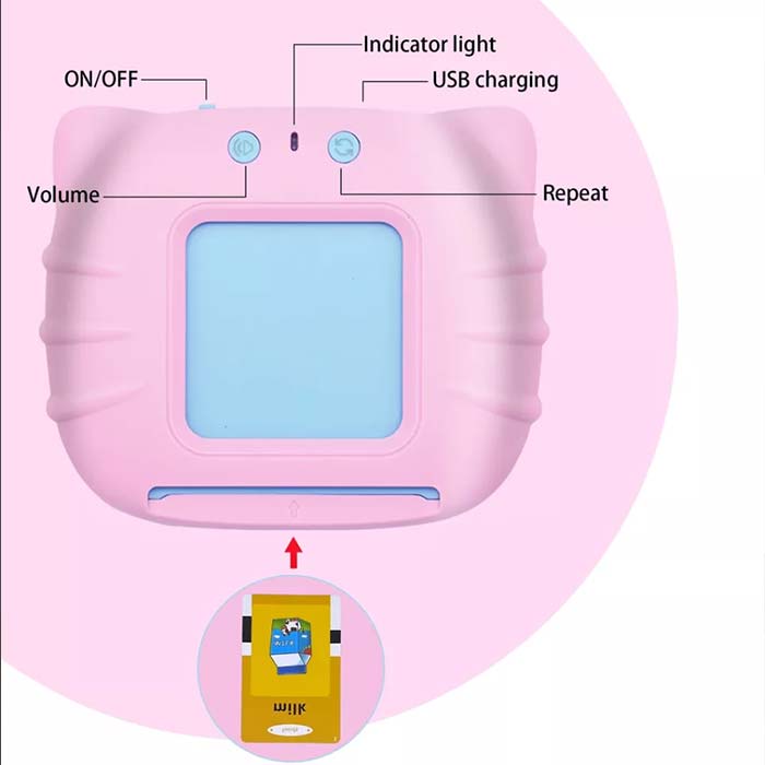 Seade saab toite kaasasoleva USB-kaabli kaudu. Punane tuli tähendab, et seade laeb, sinine tuli tähendab, et seade töötab ja roheline tuli tähendab, et sisestatud kaart on tuvastatud. Mänguasja saate sisse lülitada lülitusnupu abil, mis asub mänguasja allosas. Kui liigutate lüliti asendisse ON, lülitub see sisse ja kui liigutate selle asendisse OFF, lülitub see välja. Kui seade on sisse lülitatud, sisesta kaart ja mänguasi tuvastab kaardi ja hääldab pildile joonistatud objekti/looma/toidu vms nime. Nii õpib laps inglise keele hääldust ja samas seob õige inglise keele häälduse kaardil oleva pildiga. Helinupp võimaldab reguleerida heli tugevust. Ümarate nooltega nupul hääldab mänguasi sõna uuesti.