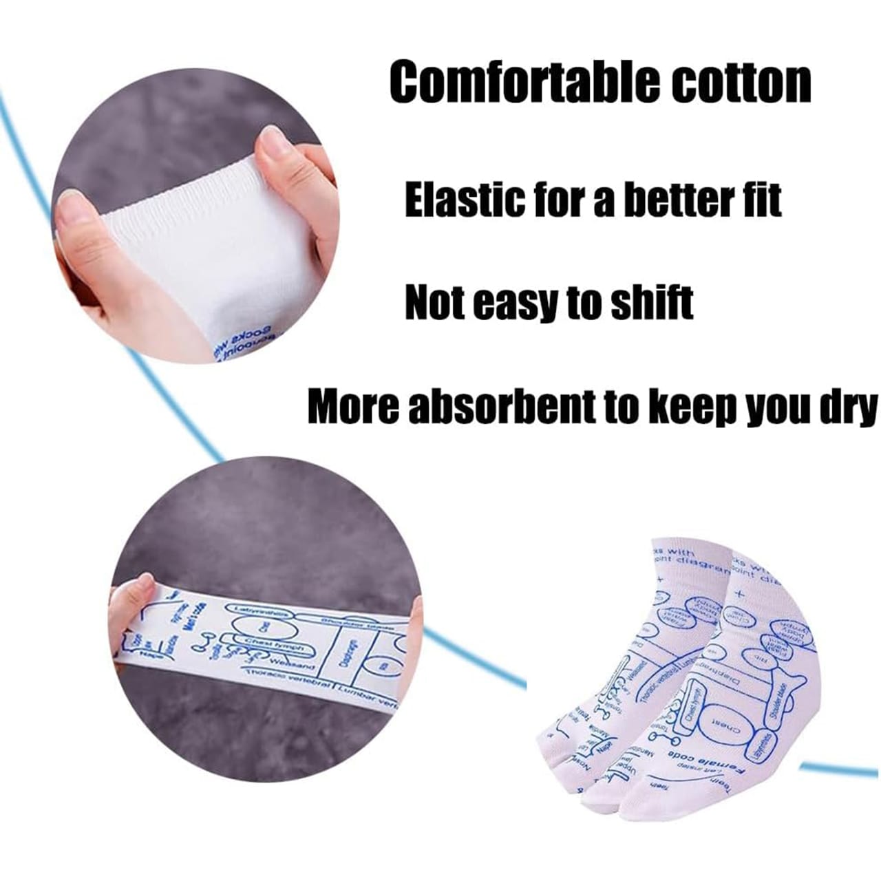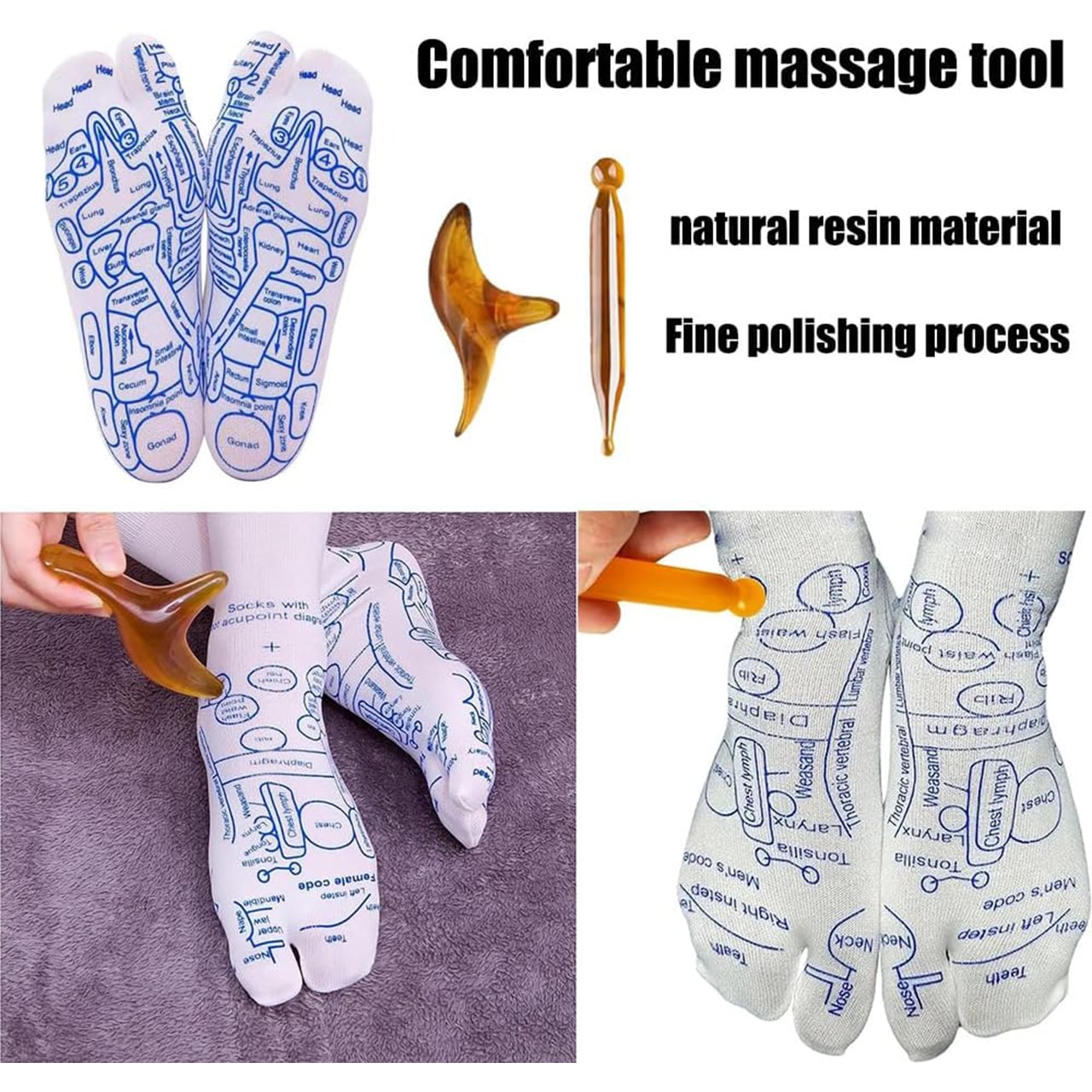 Soovitame käsitsi pesta ja kuivatada. Kandke sokke tihedalt. Kasutage massaažipulka, et suruda sokkidele joonistatud punktidele.