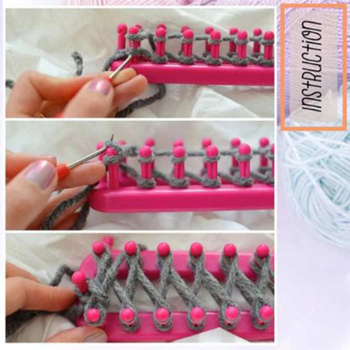 Keeruta lõng kudumisvahendi ümber ja tee sõlm. Seejärel keera lõng kühmude ümber. Kasuta eemaldamiskonksu, et aidata endal kudumisvahendilt valmistoodangut eemaldada.